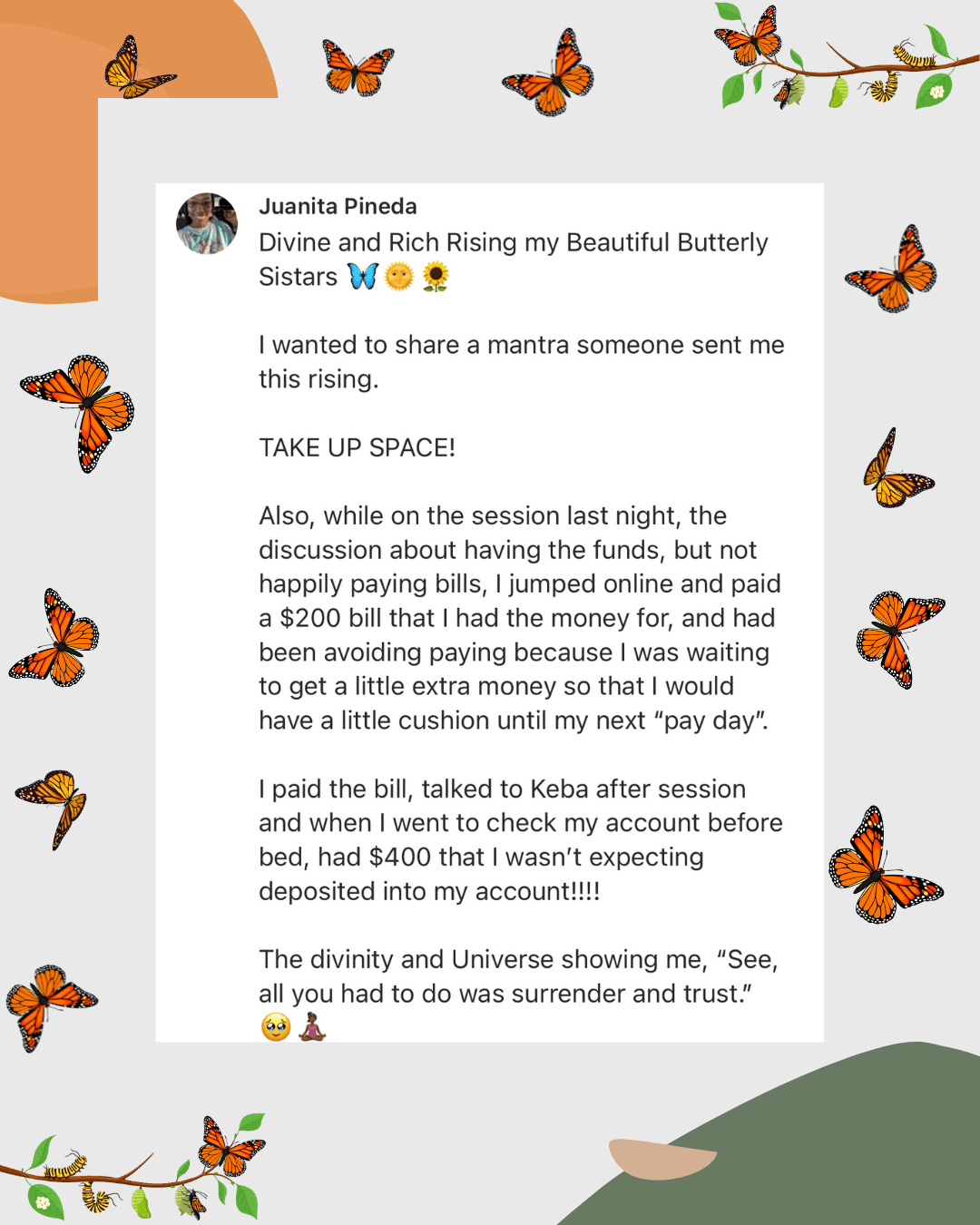 MYM isn’t just any mentorship program, it’s an experience that combines spiritual ascension with practical, real-world wisdom. I’ve fused my knowledge as a successful entrepreneur with the spiritual frameworks I’ve created to guide you through every step of your journey. This is where deep healing meets growth, and where your personal metamorphosis is nurtured and celebrated.